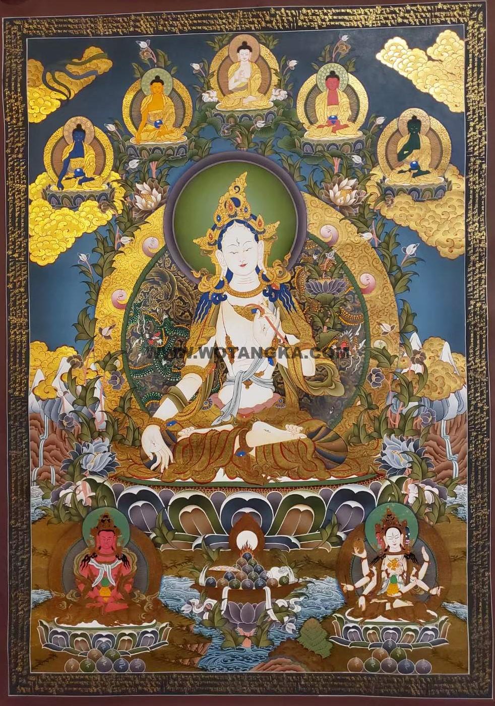 尼泊尔知名唐卡画师手绘力作《白度母·长寿三尊》唐卡手绘布本,采用24K真金描线,天然矿石颜料着色晕染,画工细腻,开脸殊胜,是一副难得一见的好唐卡作品。