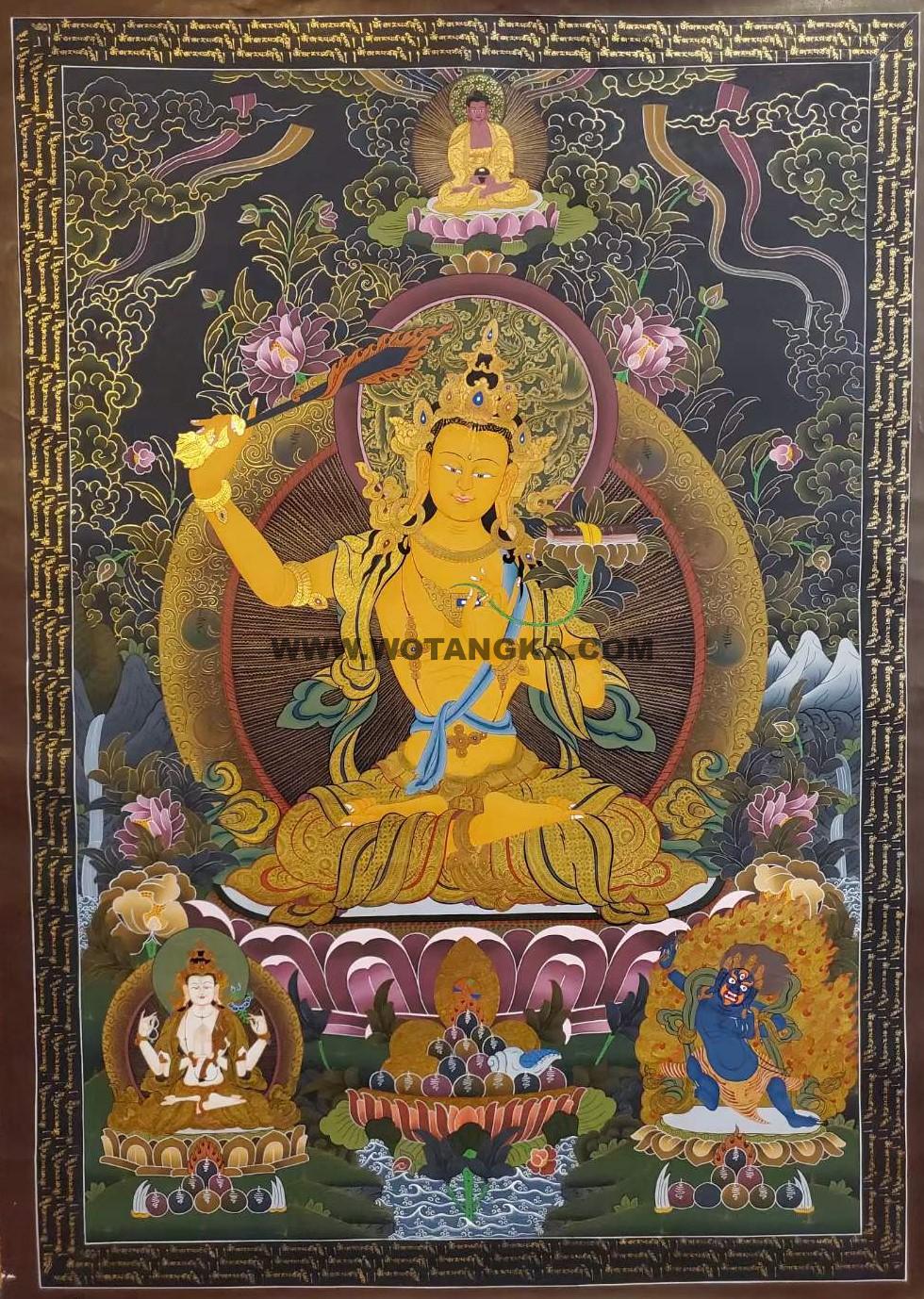 尼泊尔知名唐卡画师作品,纯手绘布本唐卡【文殊菩萨·三怙主】,作品采用24K真金金粉混合天然颜料纯手绘而成。作品主尊宝相传神。布图干净精美、画工非常的细腻,严格的遵照佛经的度量仪轨如法绘制,期待有缘人。