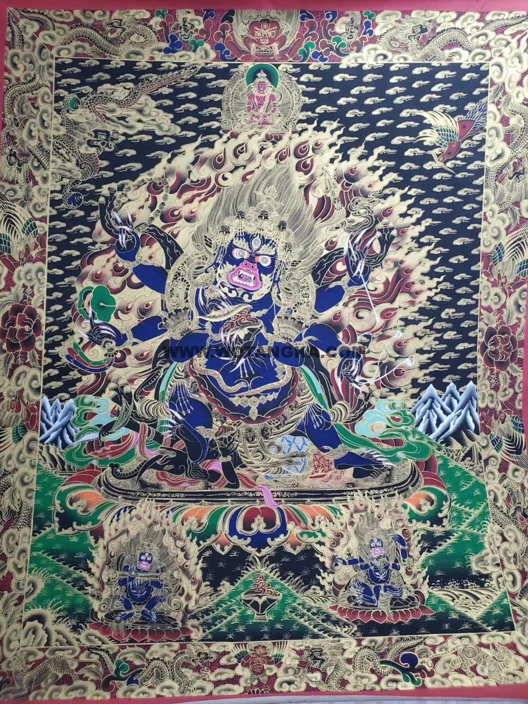 玛哈嘎拉是梵语,意思是“大黑”,即“怙主”之意。玛哈嘎拉是佛教三根本的化身。其为调伏刚强众生而呈现忿怒相,本尊及眷属护法众除护持佛法外,依缘起多示现为两臂、四臂、六臂黑,白等形象,为藏传佛教诸宗共同推崇的智慧护法。