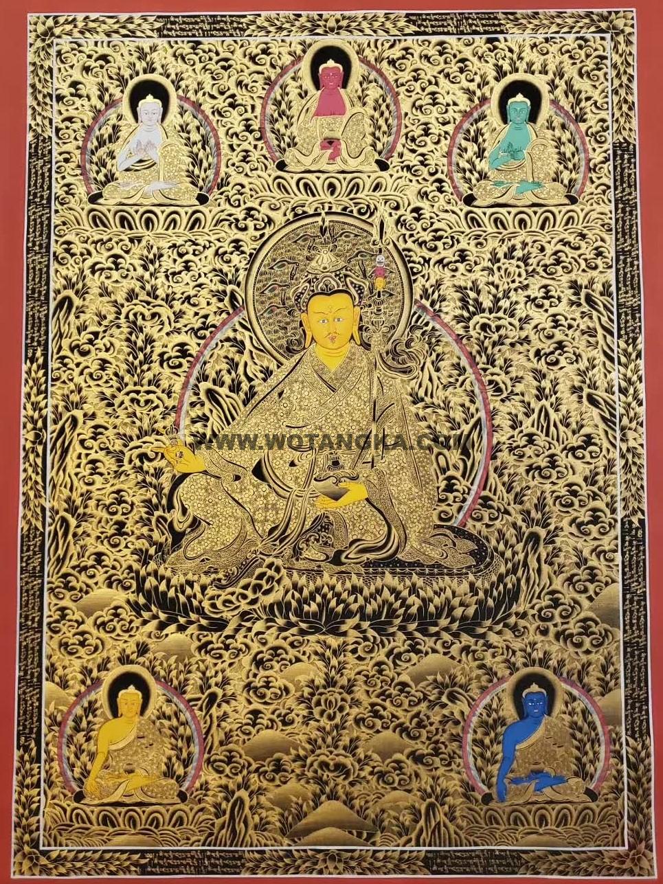 尼泊尔成名画师力作精品【莲花生大士】唐卡,作品采用24K真金金粉混合矿物颜料纯手绘而成,主尊宝相传神,布图精美、画工非常的细腻,严格的遵照佛经的度量仪轨如法绘制,期待有缘人。