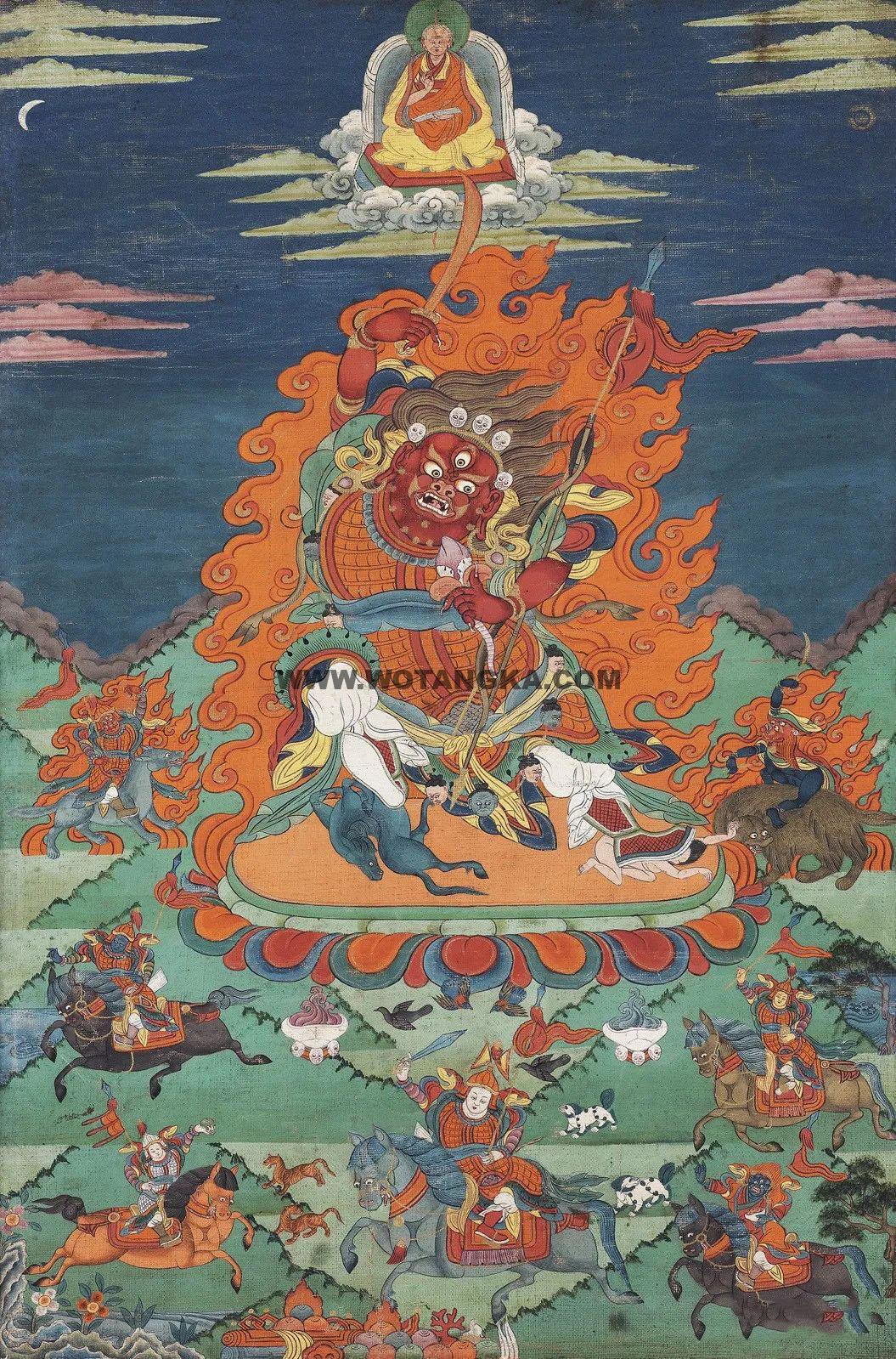大红司命主,又称“姊妹护法”,”皮铠甲护法”,“战神大王姜柴”,是藏传佛教格鲁派中最重要的护法神,也是历代班禅大师的保护神。原为密教晚期掌管战争的护法神,经三世达赖喇嘛收伏修密,而成为格鲁教的重要不共护法。