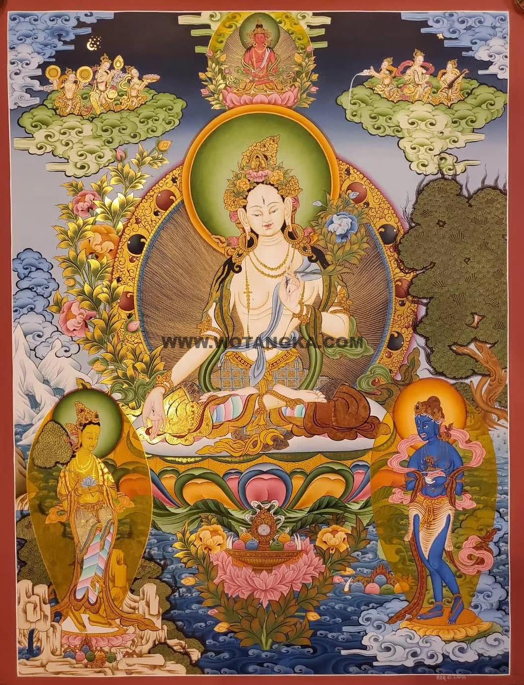 尼泊尔知名唐卡画师手绘力作,纯手绘布本唐卡【白度母】,作品采用24K真金金粉混合天然颜料纯手绘而成。作品主尊宝相传神。布图干净精美、画工非常的细腻,严格的遵照佛经的度量仪轨如法绘制,期待有缘人。