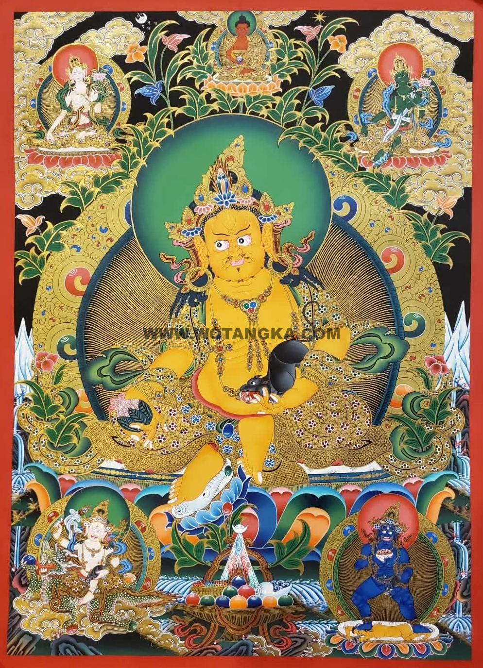 尼泊尔知名唐卡画师作品,纯手绘布本唐卡【黄财神】,作品采用24K真金金粉混合天然颜料纯手绘而成。作品主尊宝相传神。布图干净精美、画工非常的细腻,严格的遵照佛经的度量仪轨如法绘制,期待有缘人。