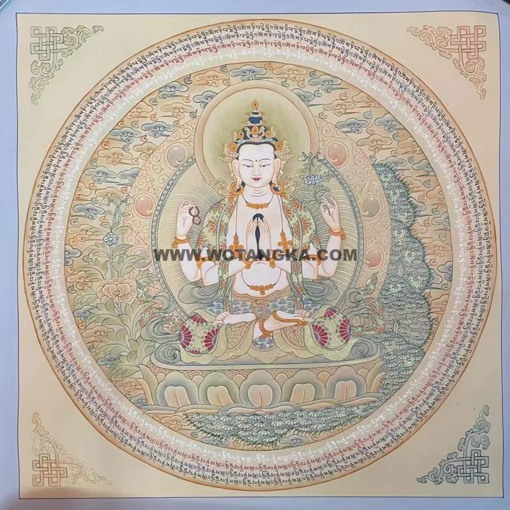 尼泊尔成名画师手绘力作,纯手绘布本唐卡【四臂观音坛城】,作品采用24K真金金粉混合天然颜料纯手绘而成。作品主尊宝相传神。布图干净精美、画工非常的细腻,严格的遵照佛经的度量仪轨如法绘制,期待有缘人。