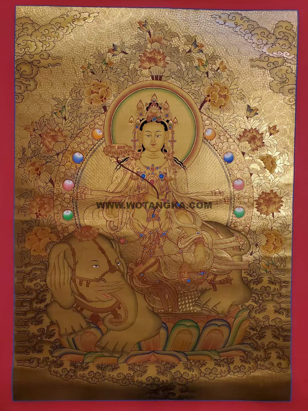 尼泊尔成名喇嘛力作【普贤菩萨】手绘布本唐卡。作品采用金粉混合矿物颜料纯手绘而成。作品主尊宝相传神。布图精美、四周经文围绕画工非常的细腻,严格的遵照佛经的度量仪轨如法绘制,期待有缘人。