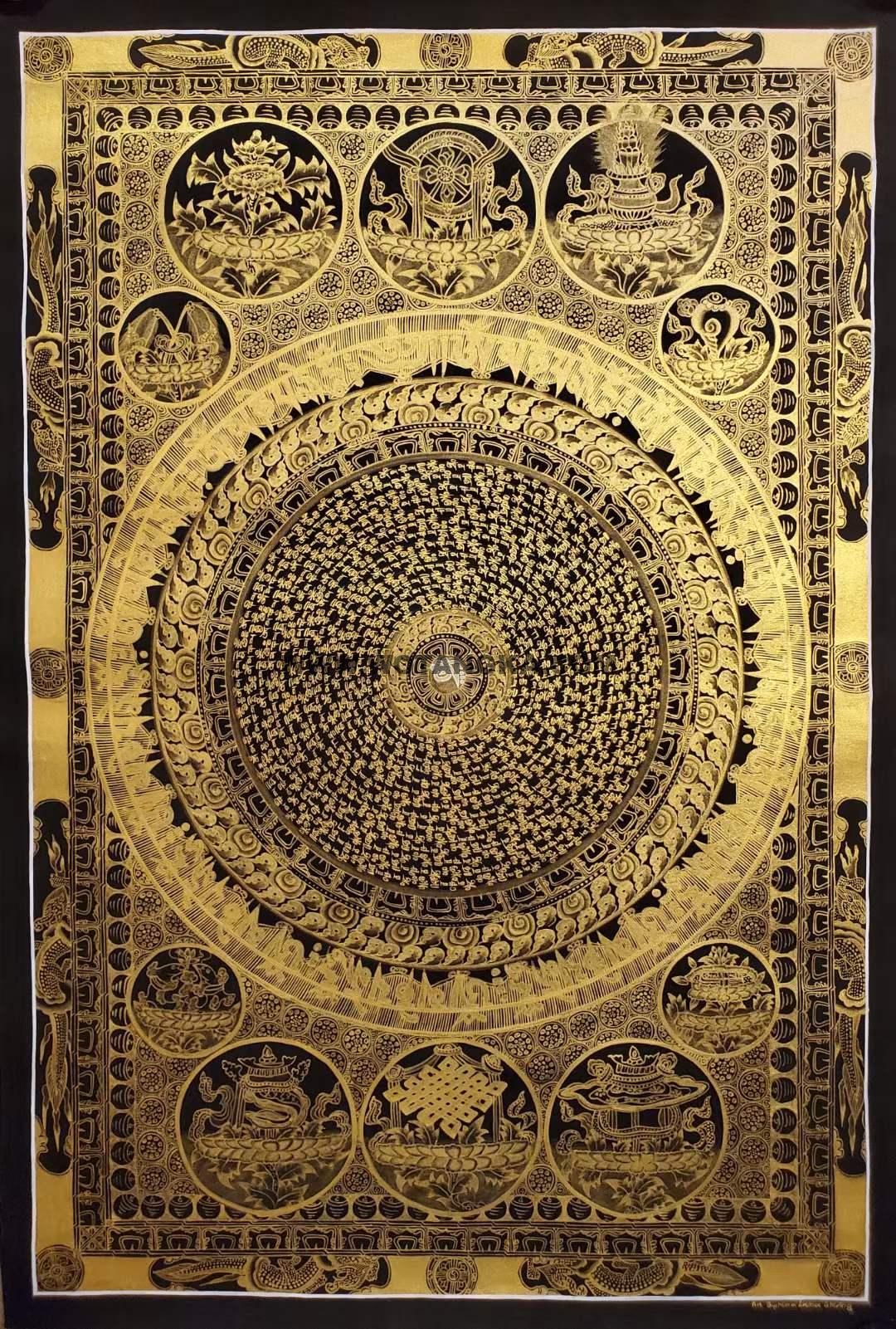 尼泊尔国宝级知名画僧那噶王(Nawang Lama)亲绘,《吉祥八宝坛城》唐卡由那噶王(Nawang Lama)喇嘛签名。 画工精美细腻,金线如发丝,晕染和描金相当的完美,难得的高品质精品唐卡,值得收藏的经典之作。 采用24K真金描线,天然矿石颜料着色晕染。画工细腻,开脸殊胜,是一副难得一见的好唐卡。