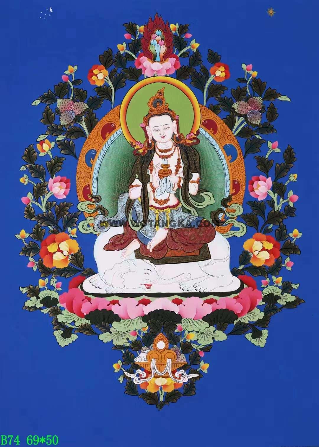 尼泊尔知名画师力作《普贤菩萨》手绘布本唐卡。作品采用金粉混合矿物颜料纯手绘而成。作品主尊宝相传神。布图精美,画工非常的细腻,严格的遵照佛经的度量仪轨如法绘制,期待有缘人。