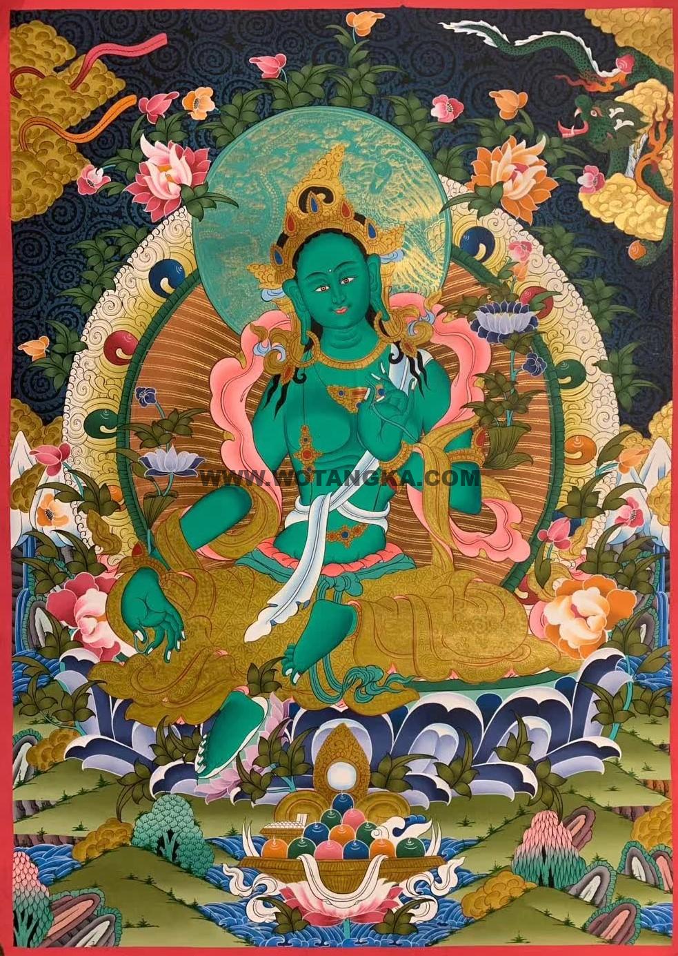尼泊尔知名唐卡画师手绘力作《绿度母》唐卡手绘布本,采用24K真金描线,天然矿石颜料着色晕染,画工细腻,开脸殊胜,是一副难得一见的好唐卡作品。