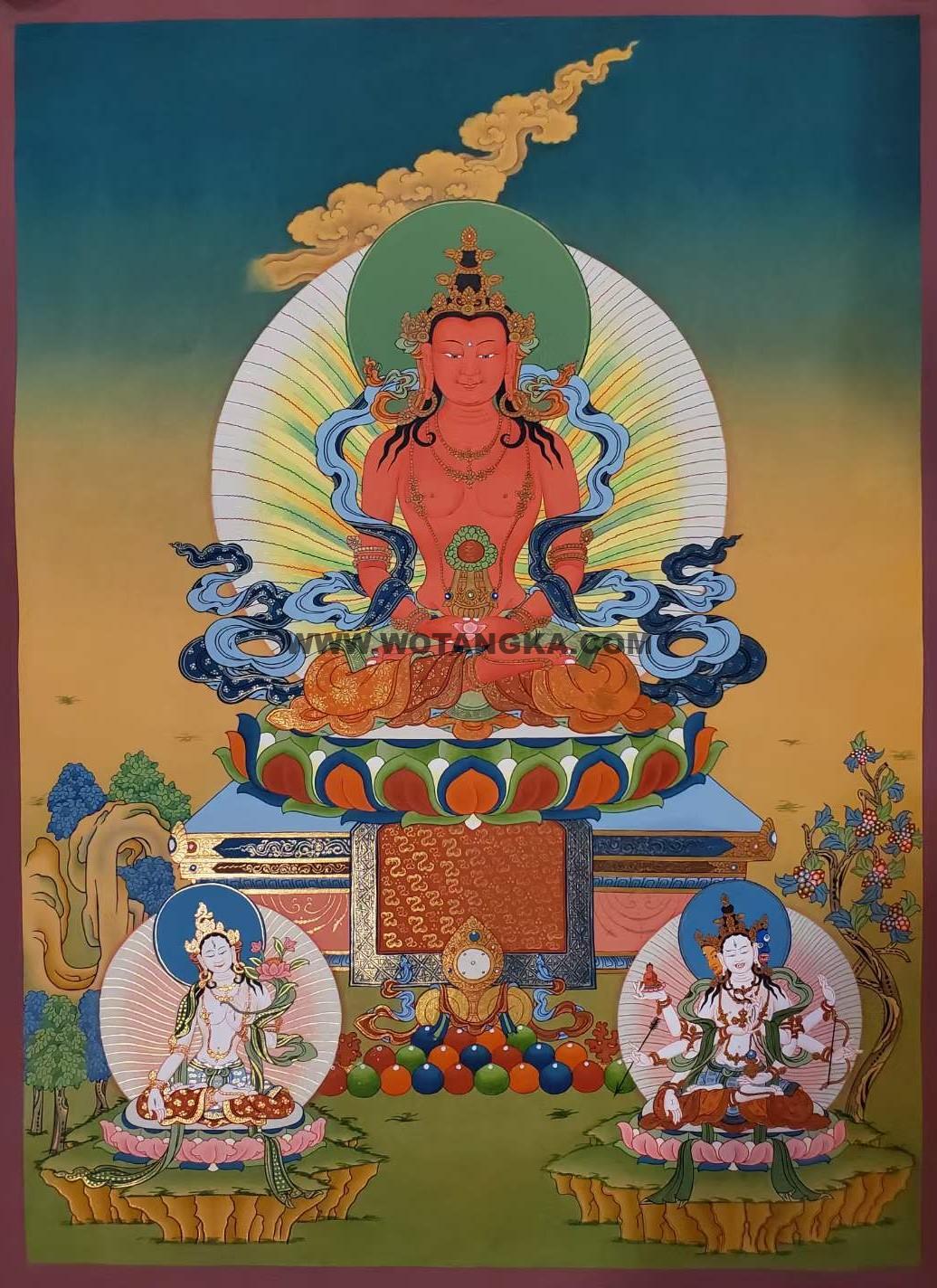 在藏传佛教中,长寿佛、尊胜佛母、白度母被认为是福寿吉祥的象征,称为“长寿三尊”,是西藏诸多寺庙中常见的佛像组合形式。长寿三尊一般以长寿佛为中央主尊,左下是白度母,右下是尊胜佛母。