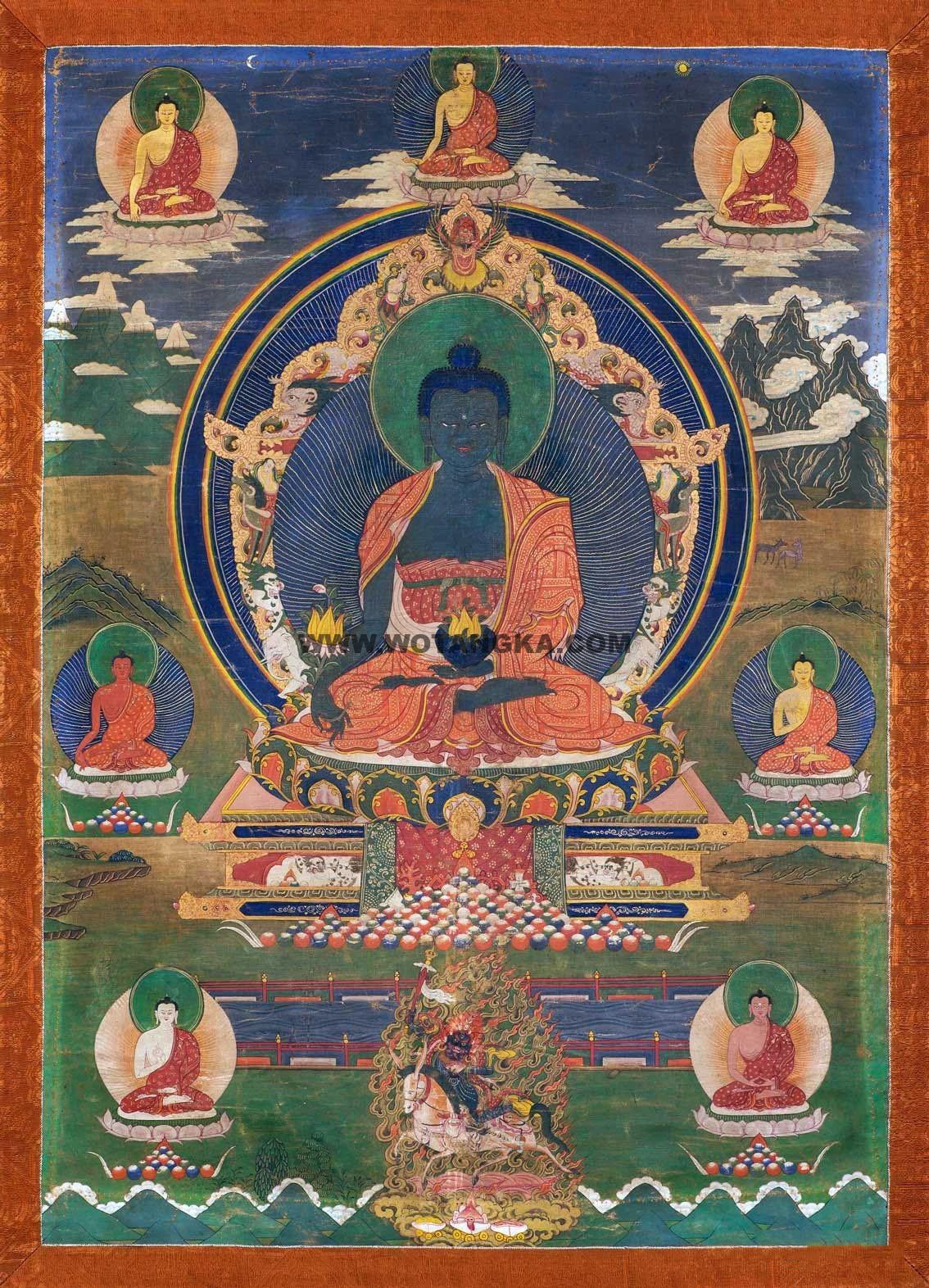 此幅中央主尊为药师佛标准形象,头饰螺发,身披袈裟,具备佛的一切相好特征,左手以禅定印置双膝上托药钵,右手以施予印置右膝拈药花,神态庄严慈祥,结跏趺端坐于方形台座承托的仰莲花上,身后有头光、身光、彩虹背光及六拏具装饰,极富装饰性。药师佛行菩萨道时,曾发十二大誓愿,满足了众生一切愿望,为众生求得了安康快乐的誓愿。
