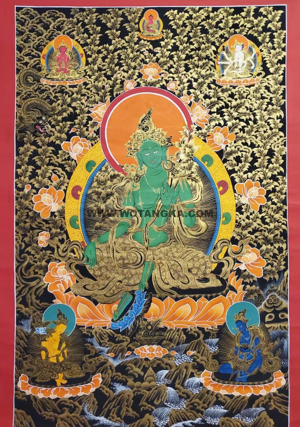 尼泊尔知名唐卡画师手绘力作《绿度母》唐卡手绘布本,采用24K真金描线,天然矿石颜料着色晕染,画工细腻,开脸殊胜,是一副难得一见的好唐卡作品。