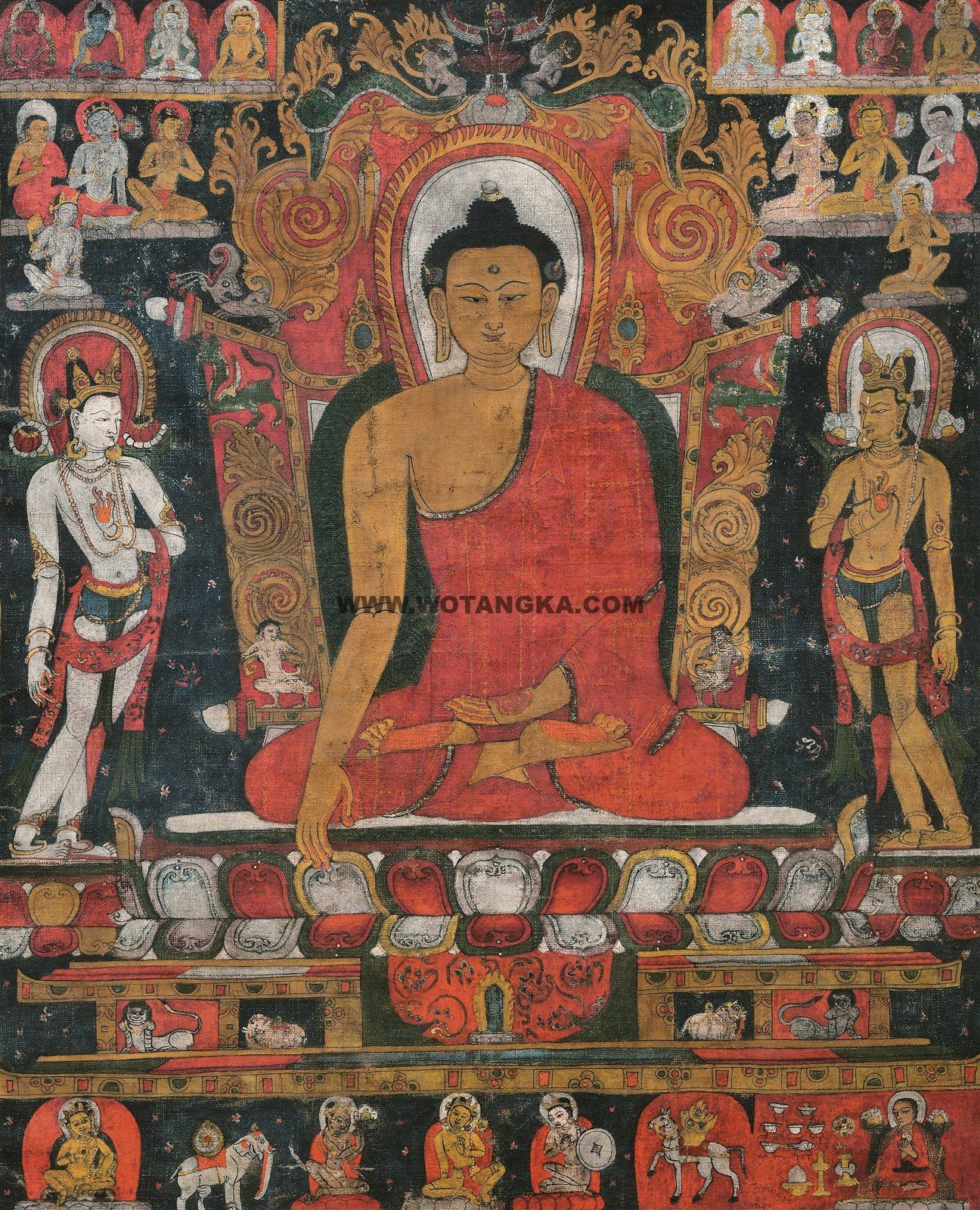 公元10世纪末,藏传佛教复兴之火于藏西阿里地区和安多河湟地区被重新点燃,在西藏各地方势力的支持下,佛教得以迅速扩展至整个藏区,佛教艺术也随之呈现出蓬勃发展的态势。东北印度帕拉艺术,这种承袭古印度笈多艺术精髓、以典雅华美著称的艺术风格在众多印度入藏弘法大师的推崇下,得到了当时西藏僧俗各界的喜爱和追捧。其艺术风韵在融合了西藏本土审美意趣后,形成了极富地域特色的帕藏艺术风格,成为12至13世纪西藏佛教艺术的主流样式,并对其后西藏佛教艺术的发展产生了极大影响。这幅13世纪释迦牟尼佛唐卡,就是一幅帕藏风格绘画的经典之作。