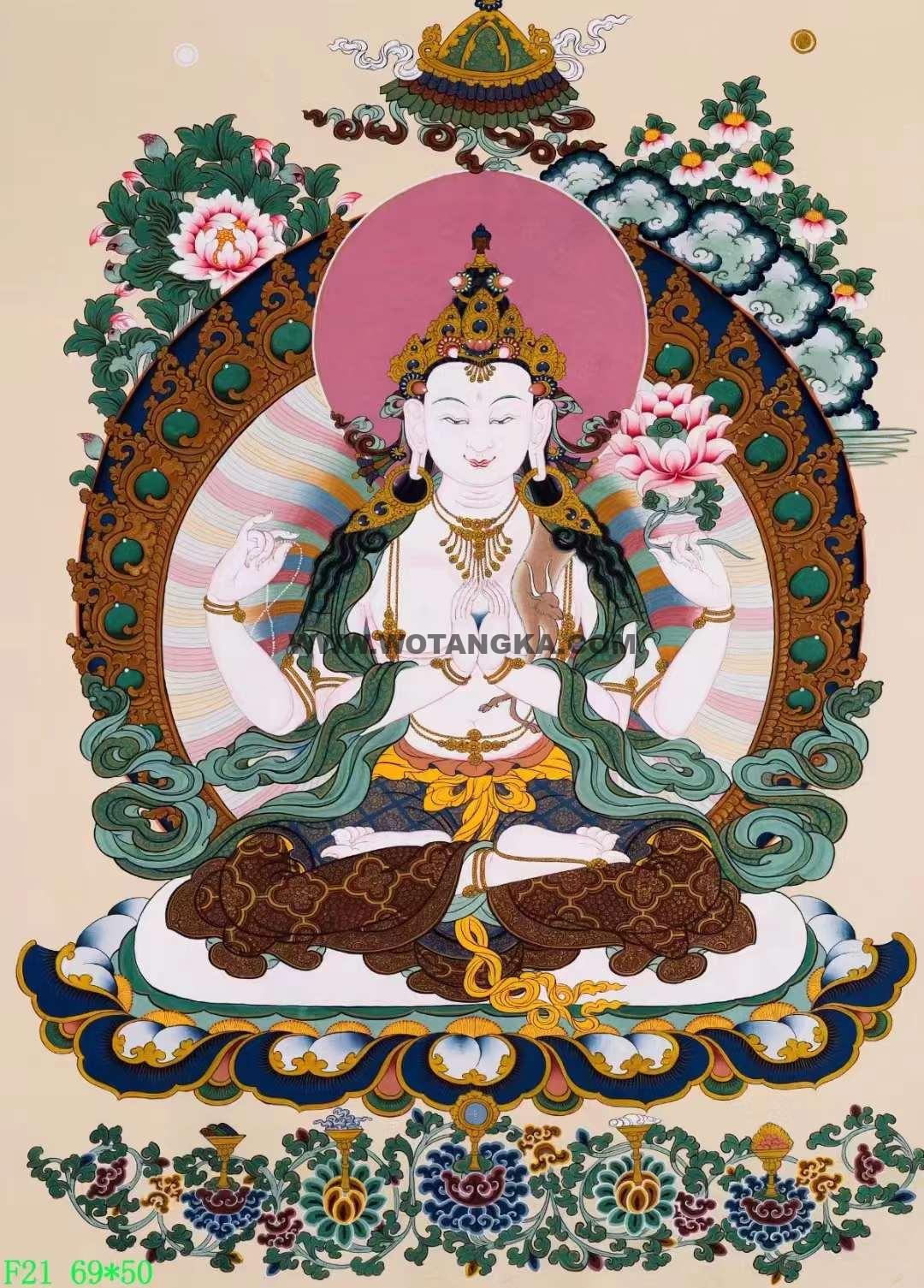 四臂观音是雪域西藏的守护神,藏人由老至幼家家户户,皆吟诵其六字大明咒:“嗡嘛呢叭咪吽”。四臂观音与文殊菩萨、金刚手菩萨,合称三族姓尊,代表大悲、大智、大力,为密乘行者人人必修的法门。