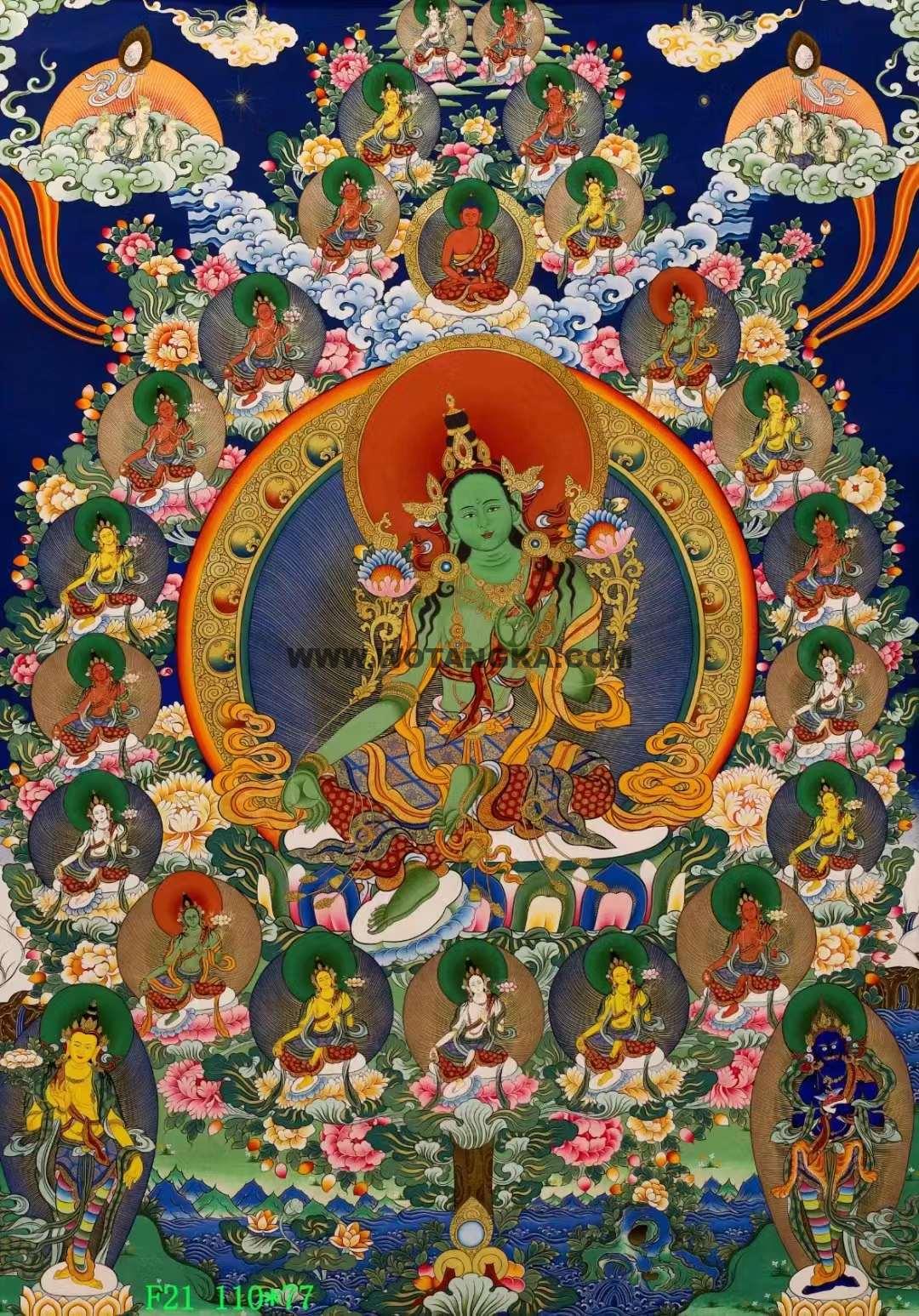 中国唐卡艺术作品中的【二十一度母】唐卡手绘布本,热贡知名画师力作,收藏供奉不要错过。作品主尊宝相传神, 采用天然矿石晕染,纯金描线,画工细腻,殊胜,精美、风格富丽,采用24K真金描绘,画工细腻,开脸殊胜,是一副难得一见的好唐卡作品。