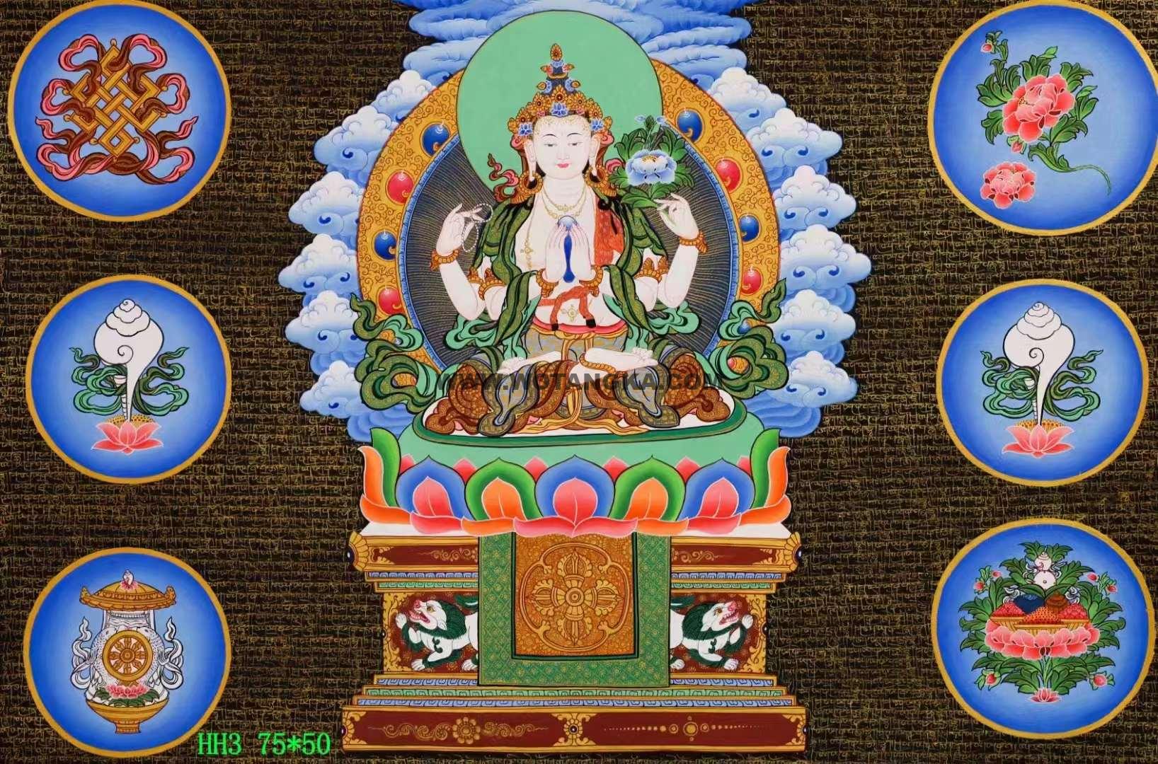 四臂观音与文殊菩萨、金刚手菩萨,合称“三族姓尊”(雪域三怙主)、“事部三怙主”,分别代表大悲、大智、大力,故又称“悲智力三部主”,为密乘行者人人必修的法门。