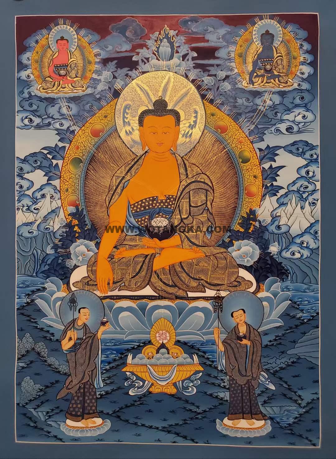 尼泊尔知名唐卡画师手绘力作,纯手绘布本唐卡【释迦牟尼佛】,作品采用24K真金金粉混合天然颜料纯手绘而成。作品主尊宝相传神。布图干净精美、画工非常的细腻,严格的遵照佛经的度量仪轨如法绘制,期待有缘人。