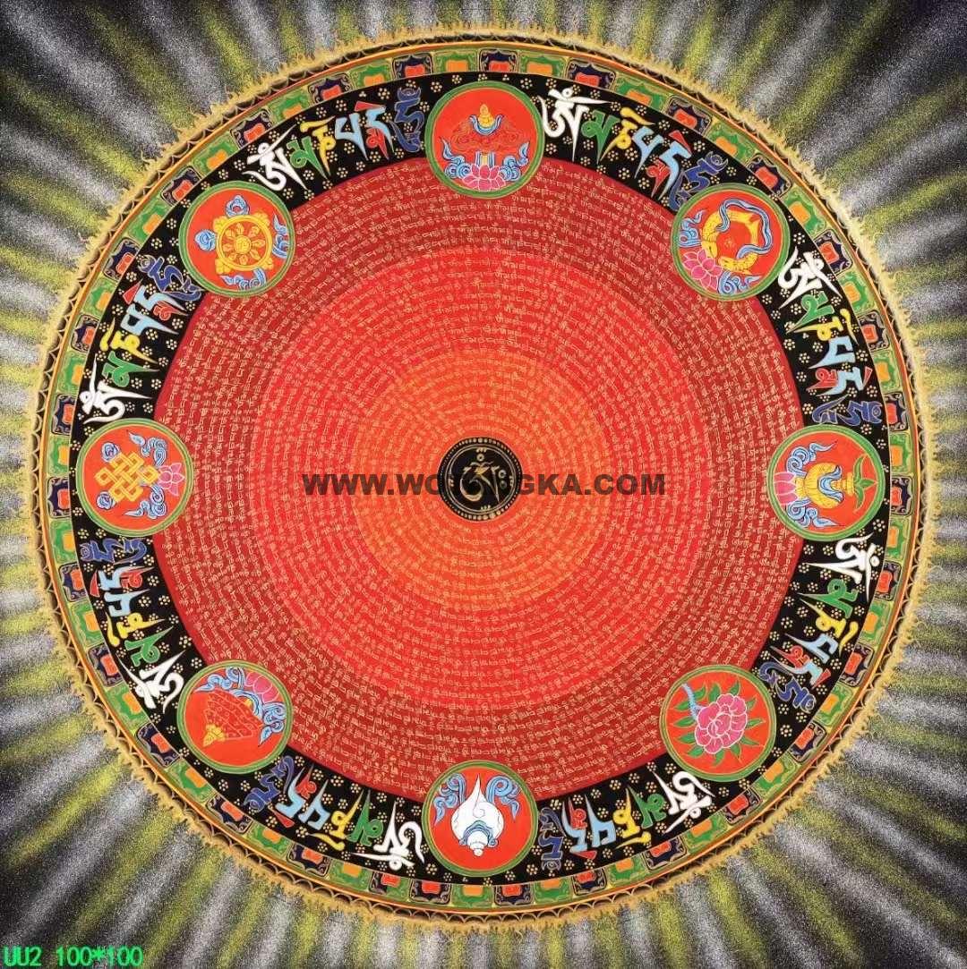 坛城象征宇宙本源,是圣坛的代表,挂与家里玄关之处,有镇宅辟邪的妖邪不入的作用,古代著名寺院皇宫都用此法门来镇宅辟邪,十分殊胜。喜欢不要错过。六字大明咒是观世音菩萨心咒,源于梵文中,此咒含有诸佛无尽的加持与慈悲,是诸佛慈悲和智慧的音声显现。能改变命运,修成幸福健康的人生。