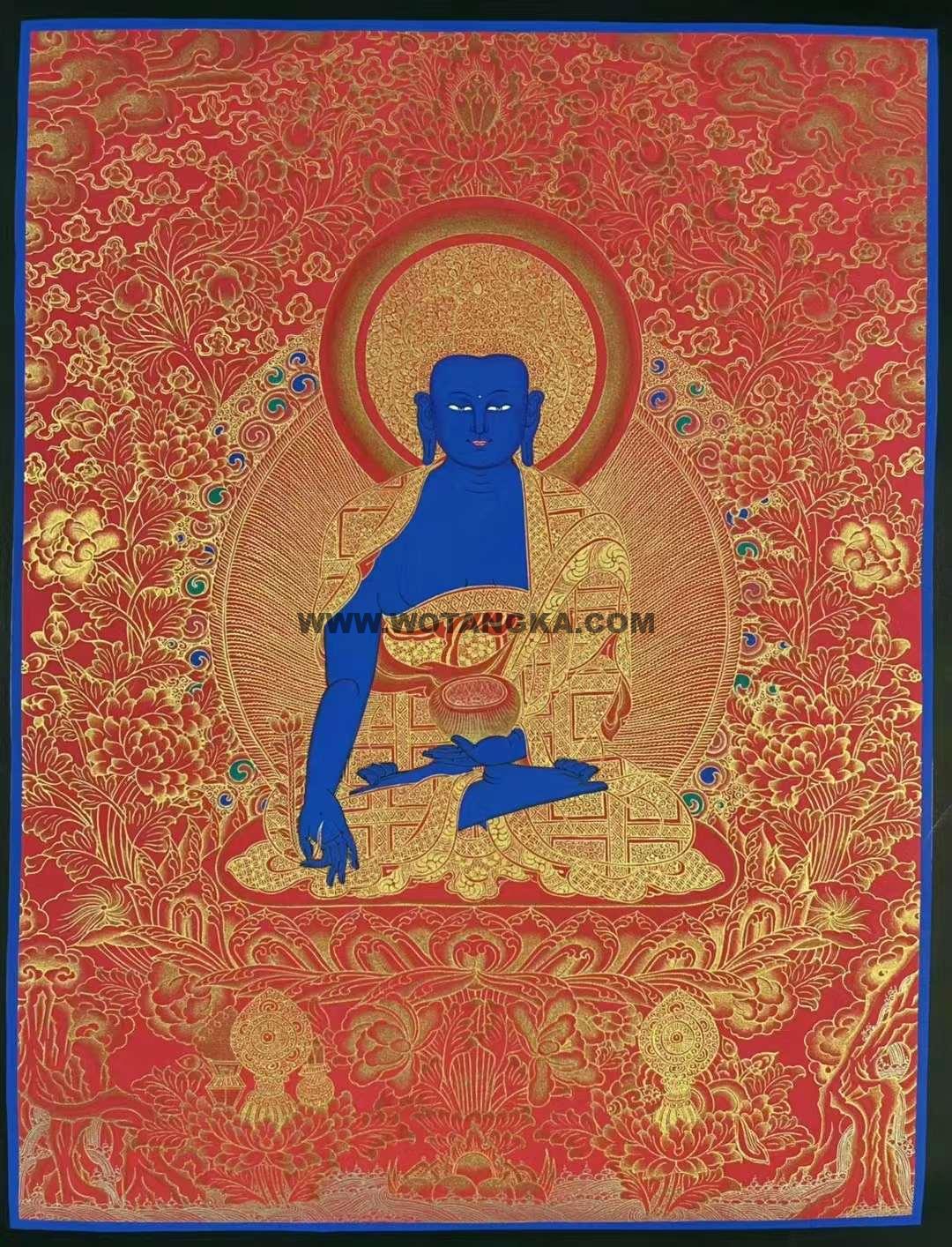 尼泊尔精品唐卡,尼泊尔知名画师《药师佛》唐卡手绘布本。采用24K真金描线,红底色打底,天然矿石颜料着色晕染。画工细腻,开脸殊胜,是一副难得一见的好唐卡。作品主尊宝相传神,布图干净精美、画工非常的细腻,严格的遵照佛经的度量仪轨如法绘制,期待有缘人。