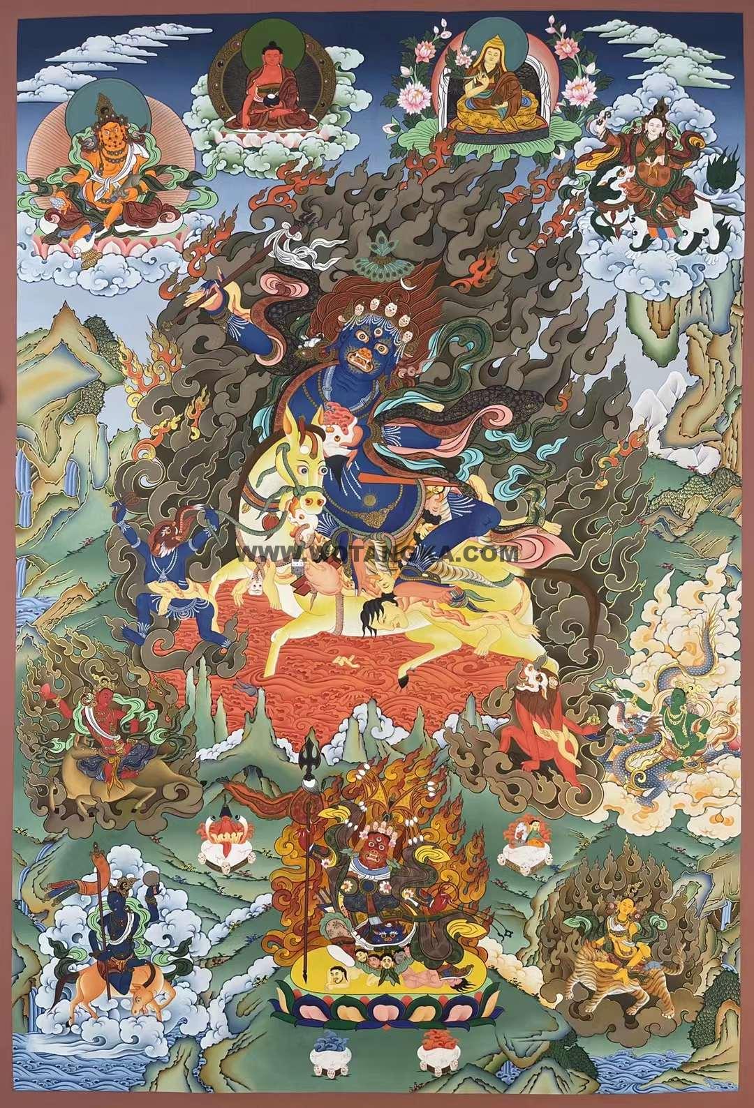尼泊尔知名唐卡画师巴桑力作纯手绘布本横幅唐卡【吉祥天母】,满工纯金作品,画工精湛,色彩晕染到位,火炎拉金细致,各尊人物惟妙惟肖。布图干净精美、画工非常的细腻,严格的遵照佛经的度量仪轨如法绘制,期待有缘人。