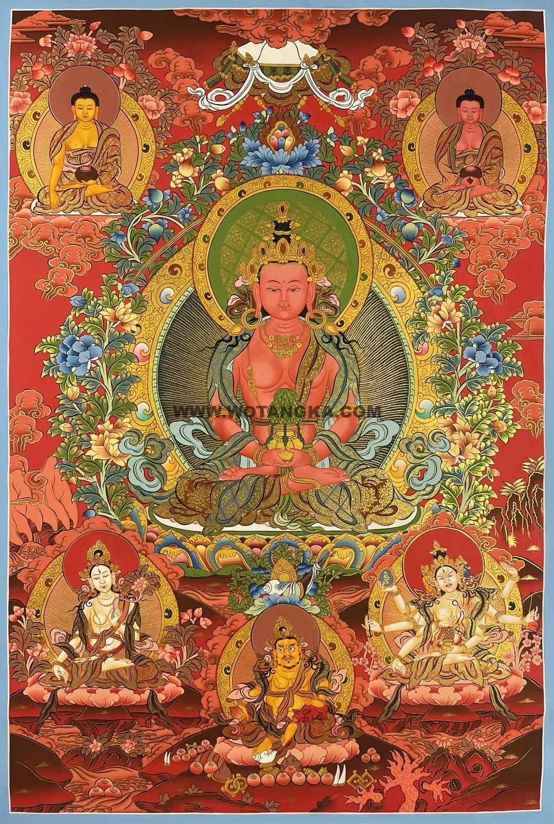 尼泊尔知名唐卡画师布塔力作《长寿佛·长寿三尊》唐卡手绘布本,作品采用24K真金描线,天然矿石颜料着色晕染,画工细腻,开脸殊胜,是一副难得一见的好唐卡作品。