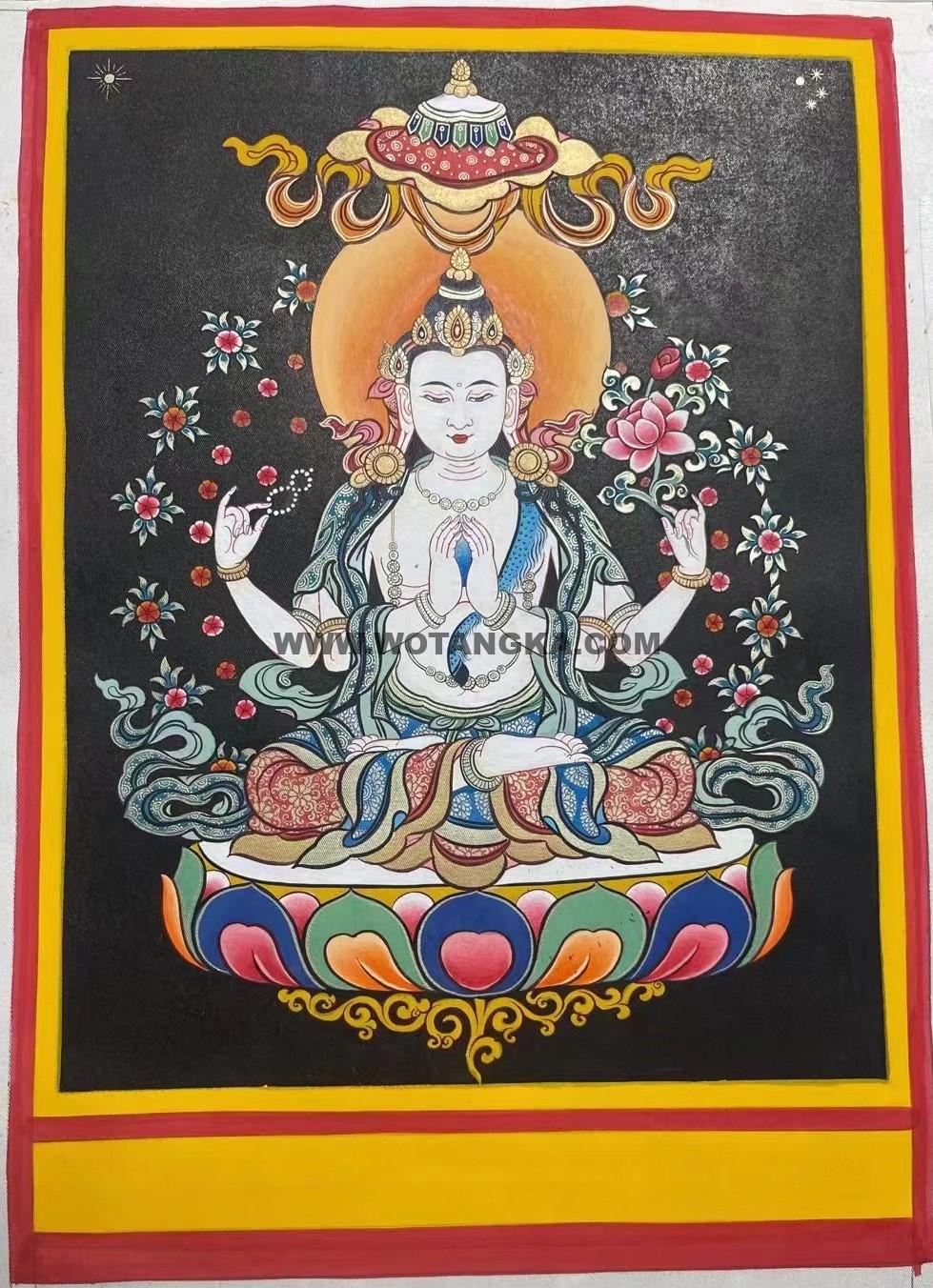 中国唐卡艺术作品中的【四臂观音】唐卡手绘布本,热贡知名画师,民间工艺师维玛扎西力作,收藏供奉不要错过。作品主尊宝相传神, 采用天然矿石晕染,纯金描线,画工细腻,殊胜,精美、风格富丽,采用24K真金描绘,画工细腻,开脸殊胜,是一副难得一见的好唐卡作品。