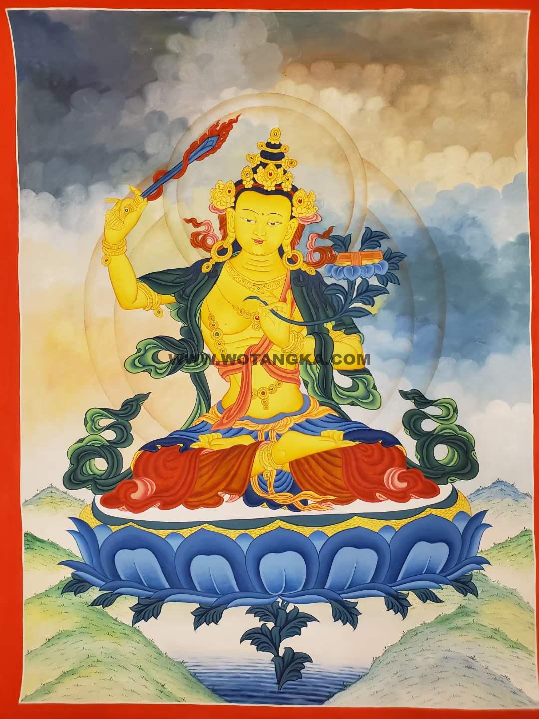 尼泊尔知名唐卡画师力作精品【文殊菩萨】唐卡,作品采用24K真金金粉混合矿物颜料纯手绘而成,主尊宝相传神,布图精美、画工非常的细腻,严格的遵照佛经的度量仪轨如法绘制,期待有缘人。