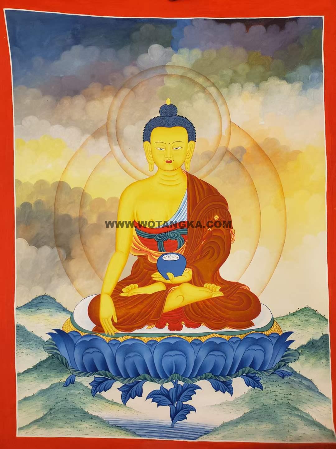 尼泊尔知名唐卡画师手绘力作,纯手绘布本唐卡【释迦牟尼佛】,作品采用24K真金金粉混合天然颜料纯手绘而成。作品主尊宝相传神。布图干净精美、画工非常的细腻,严格的遵照佛经的度量仪轨如法绘制,期待有缘人。