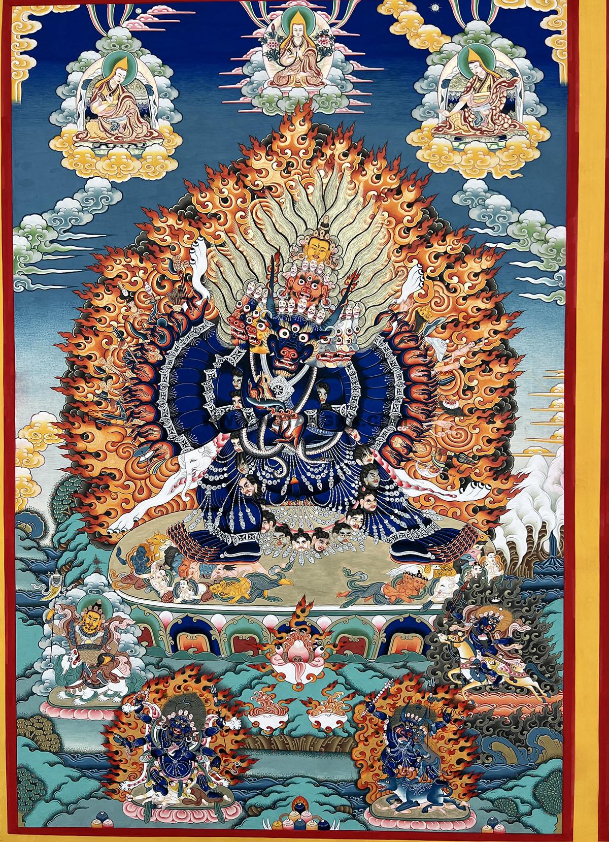 中国唐卡艺术作品中的【大威德金刚】唐卡手绘布本,热贡知名画师东智加·画院出品,收藏供奉不要错过。作品主尊宝相传神, 采用天然矿石晕染,纯金描线,画工细腻,殊胜,精美、风格富丽,采用24K真金描绘,画工细腻,开脸殊胜,是一副难得一见的好唐卡作品。