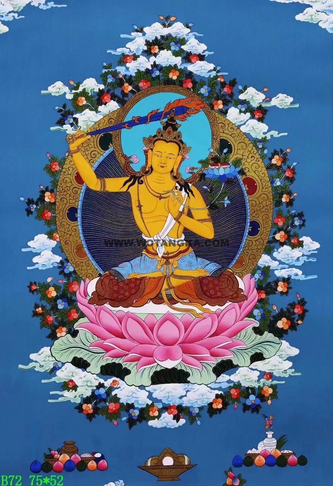 尼泊尔知名唐卡画师纯手绘布本唐卡【文殊菩萨】,作品采用24K真金金粉混合天然颜料纯手绘而成。作品主尊宝相传神。布图干净精美、画工非常的细腻,严格的遵照佛经的度量仪轨如法绘制,期待有缘人。