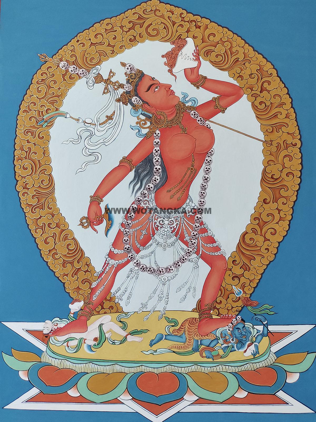 这尊优美的那若空行母右手持金刚月牙刀﹐左手高举髅皿同时还抱着一根骷髅杖。祂全身赤裸﹐头饰上刻有五颗骷髅头﹐颈上佩戴着五十颗骷髅头的项链﹐脚下踩在祂自己的化身-卡拉啦底和巴拉哇。就外相而言﹐祂们的示现代表着众生的贪瞋痴之心﹐因此踩在祂们身上象征着摧毁这些负面心态并转化为利益众生之慈悲心﹐同时也能帮助我们去除修行上的烦恼障碍如死亡﹐病苦及恶灵的干扰。祂望着‘空行淨土’﹐饮着髅皿裡的血水﹐象征着祂愿意接引一切皈依于祂的修行人于祂的清静佛土-空行淨土。修习金刚瑜珈母法门也是忏悔罪障的殊胜法门之一。祂火红色的身躯代表着祂能在适当时机现愤怒相﹐克服我们外在及内在的烦恼﹐帮助淨化我们的习气和调伏我们的心识。