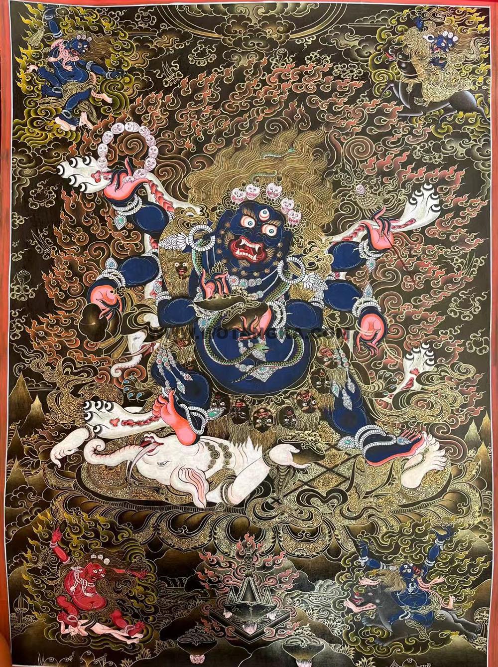 玛哈嘎拉是梵语,意思是“大黑”,即“怙主”之意。玛哈嘎拉是佛教三根本的化身。其为调伏刚强众生而呈现忿怒相,本尊及眷属护法众除护持佛法外,依缘起多示现为两臂、四臂、六臂黑,白等形象,为藏传佛教诸宗共同推崇的智慧护法。