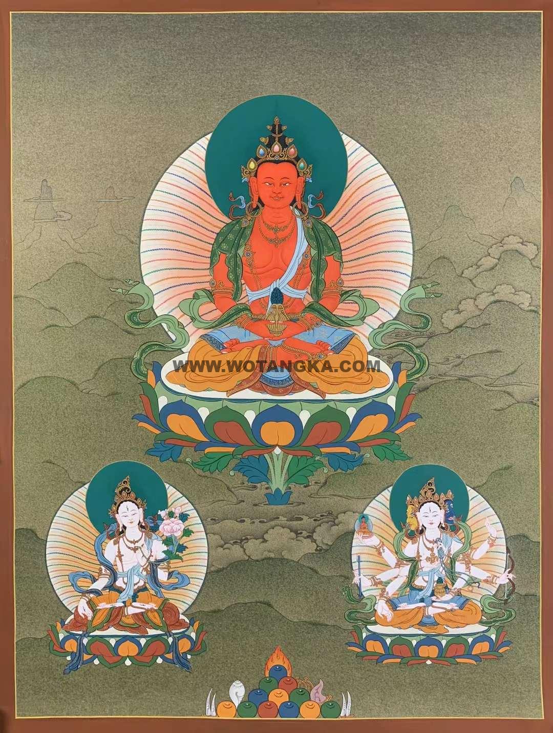 在藏传佛教中,长寿佛、尊胜佛母、白度母被认为是福寿吉祥的象征,称为“长寿三尊”,是西藏诸多寺庙中常见的佛像组合形式。长寿三尊一般以长寿佛为中央主尊,左下是白度母,右下是尊胜佛母。