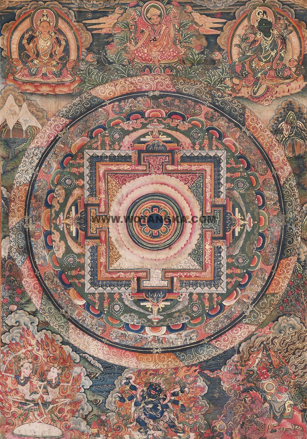 坛城,或称曼陀罗,梵文音译,旧译为“坛城”;新译为“轮圆具足或者聚集发生”。早期的坛城是古代印度的密教修行为防止魔众入侵,在修法场地所筑的圆形或方形土台。后世密教认为坛城为诸佛、菩萨、圣者的居住之处。藏传佛教中独具魅力的坛城艺术,是信徒修习佛教密宗经典时作为观想模型的重要内容,也是佛教对时空的诠释。绘制坛城必须严格遵守密宗的教义和规范,每一种坛城都有具体的“仪轨经”作为依据。