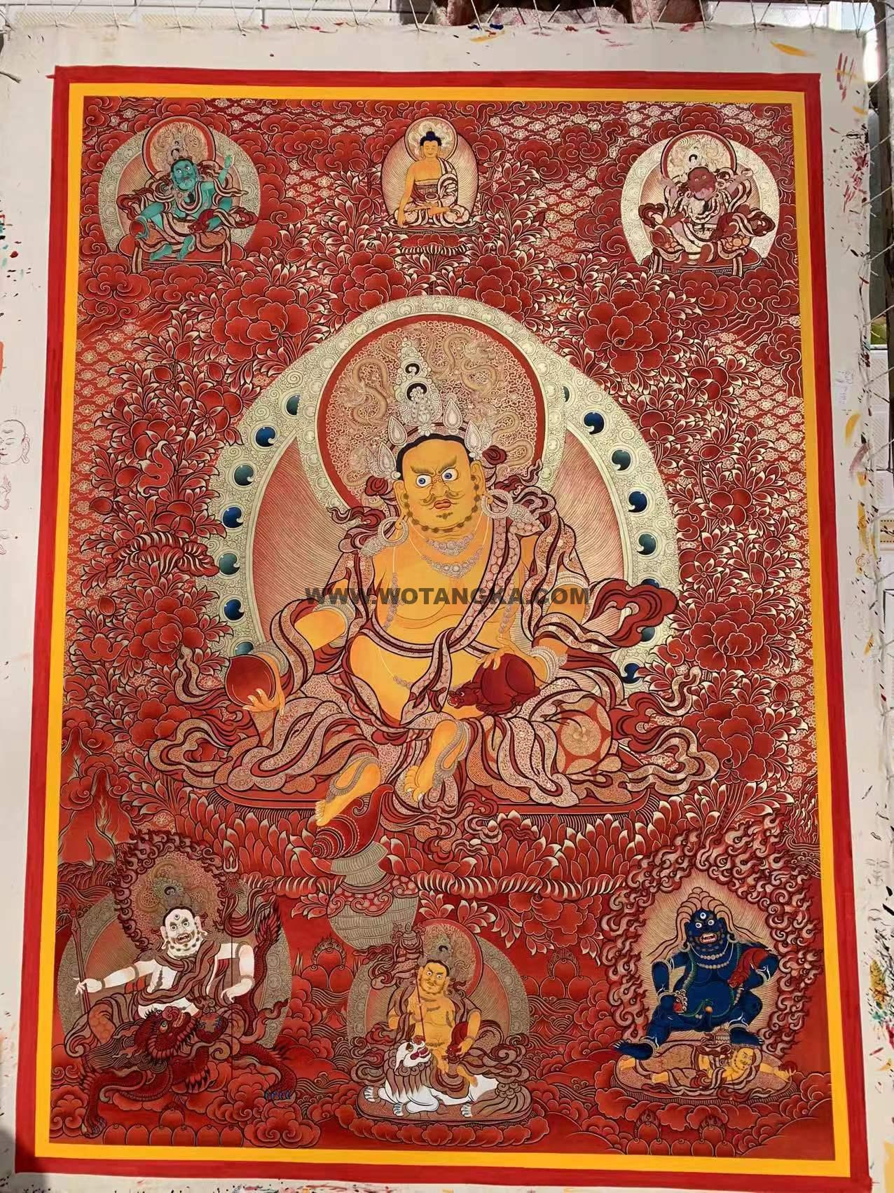 中国唐卡艺术作品中的【五方财神】唐卡手绘布本,热贡扎巴·画院的成名画师力作,收藏供奉不要错过。作品主尊宝相传神, 采用天然矿石晕染,纯金描线,画工细腻,殊胜,精美、风格富丽,采用24K真金描绘,画工细腻,开脸殊胜,是一副难得一见的好唐卡作品。