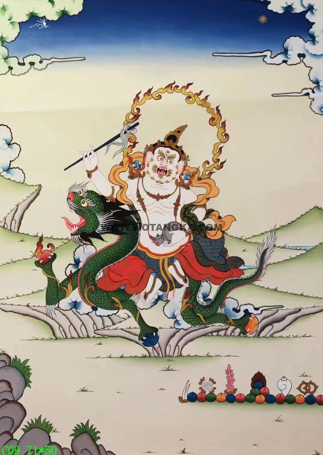 白财神又名白宝藏王,是观世音菩萨的慈悲化现。西藏密中的五路财神护法之一, 藏语称“赞布禄嘎尔布”、“藏拉噶波”,意为白财神。因为他以龙为坐骑,所以又称骑龙布禄金刚。其功德为祛病、除去一切贫苦,使众生富裕。此尊身色如雪山皓白,表消除一切众生因贫困所致的污秽,一头二臂,和悦慈祥,微带怒容,具三圆目,表悲望三世之众生,发桔红色,绻曲。右手持宝棒扬於虚空,左手捉吐宝鼠,左挟三叉杖,表示汇聚一切财神之功德能救度饥饿中的众生之苦。头戴宝冠,身披彩带,天衣绸裙,以游戏姿坐於碧龙背上,龙为骑表示解除自我和他人的一切贫穷之苦!