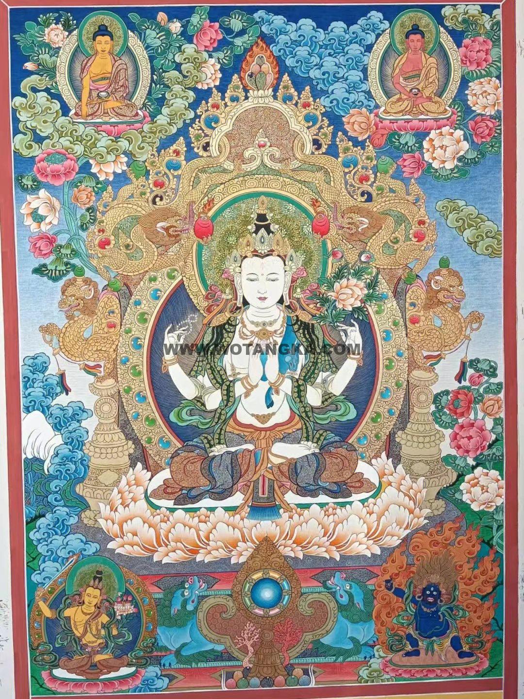 中国唐卡艺术作品中的【四臂观音·三怙主】唐卡手绘布本,热贡知名画师完德才让·画院出品,收藏供奉不要错过。作品主尊宝相传神, 采用天然矿石晕染,纯金描线,画工细腻,殊胜,精美、风格富丽,采用24K真金描绘,画工细腻,开脸殊胜,是一副难得一见的好唐卡作品。