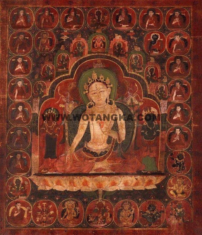 此幅唐卡,年代久远,主尊白度母周边环绕数量众多的上师、护法、成就者,这也是早期唐卡绘制的一大特点,并无蓝天绿地等景物点缀,而是以唐卡来讲述道法传承,是修行观想的重要对象。