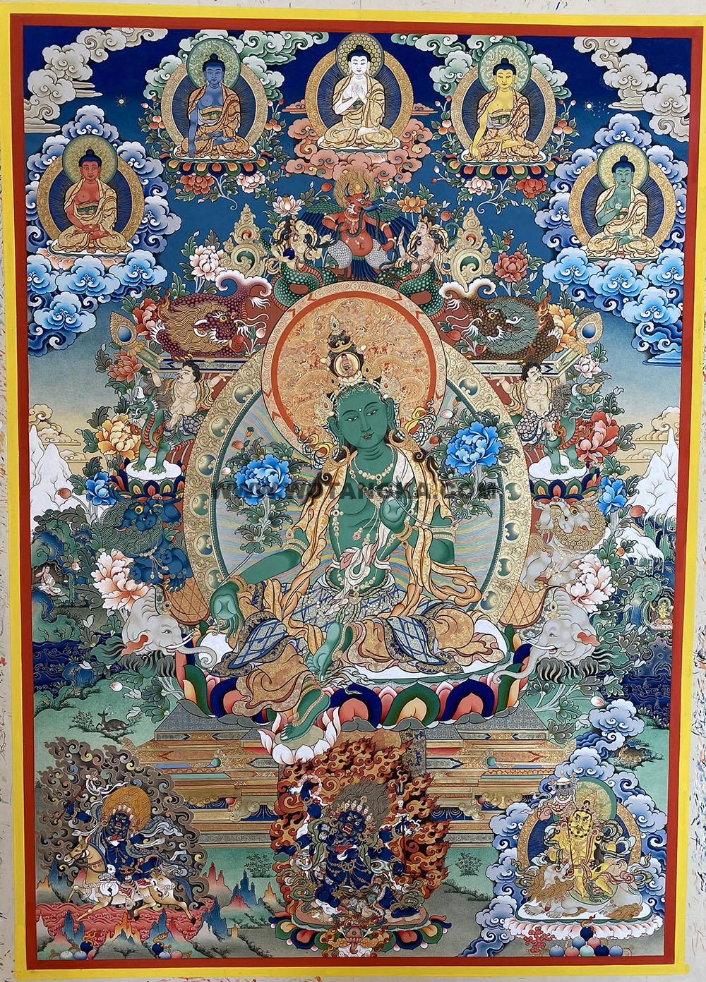 唐卡作品名称:绿度母六拏具宝座五方如来祈福供养图