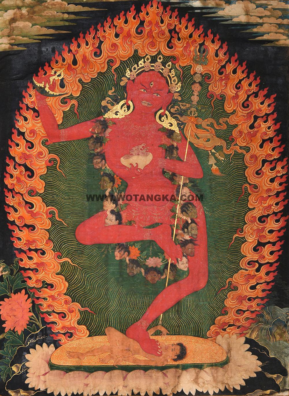 此幅唐卡画面正中,金刚瑜伽母头戴五骷髅冠,身体以正面示人,面庞长圆,三目睁视,龇牙卷舌,现忿怒样貌。