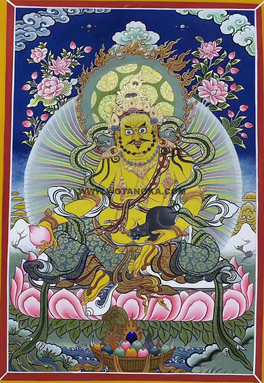 黄财神是藏传佛教各大教派普遍供养的五姓财神之一,因其身相黄色,故称黄财神。修持黄财神法、持诵其密咒,可获得黄财神庇佑,能增长福德、寿命、智能、物质及精上之受用,不被生活所逼,以及一切经济压迫,可安心向道。但修法者需发无上菩提心,广结善缘,勤行布施。万勿悭贪成性,护法降罪也. 黄财神面慈目善,头戴宝冠,坦胸露腹,戴着珍宝璎珞、珍宝耳环、珍宝手镯和珍宝足钏,上身穿丝制天衣,下身着丝制裙子,右手于右膝上捧喷焰末尼,左手握着吐宝鼬,以威镇坐姿坐在莲花宝座中央。身后有光环、祥云、远山。能增长福德、寿命、智慧、物质及精神上之受用。主司财富,能使一切众生脱于贫困,财源广进。