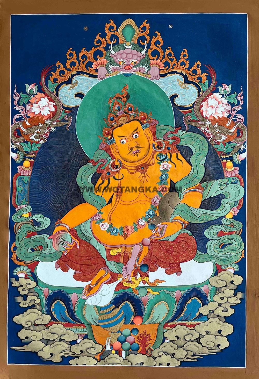 黄财神是藏传佛教各大教派普遍供养的五姓财神之一,因其身相黄色,故称黄财神。修持黄财神法、持诵其密咒,可获得黄财神庇佑,能增长福德、寿命、智能、物质及精上之受用,不被生活所逼,以及一切经济压迫,可安心向道。但修法者需发无上菩提心,广结善缘,勤行布施。万勿悭贪成性,护法降罪也. 黄财神面慈目善,头戴宝冠,坦胸露腹,戴着珍宝璎珞、珍宝耳环、珍宝手镯和珍宝足钏,上身穿丝制天衣,下身着丝制裙子,右手于右膝上捧喷焰末尼,左手握着吐宝鼬,以威镇坐姿坐在莲花宝座中央。身后有光环、祥云、远山。能增长福德、寿命、智慧、物质及精神上之受用。主司财富,能使一切众生脱于贫困,财源广进。