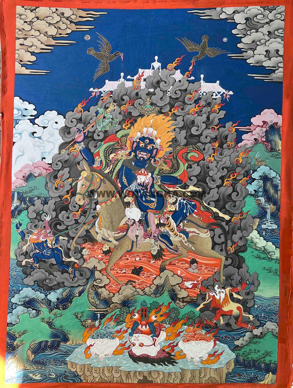 中国唐卡艺术作品中的【吉祥天母】唐卡手绘布本,西藏勉萨画派分支,日喀则泽东画派知名唐卡画师穷作品,收藏供奉不要错过。作品主尊宝相传神, 采用天然矿石晕染,纯金描线,画工细腻,殊胜,精美、风格富丽,采用24K真金描绘,画工细腻,开脸殊胜,是一副难得一见的好唐卡作品。