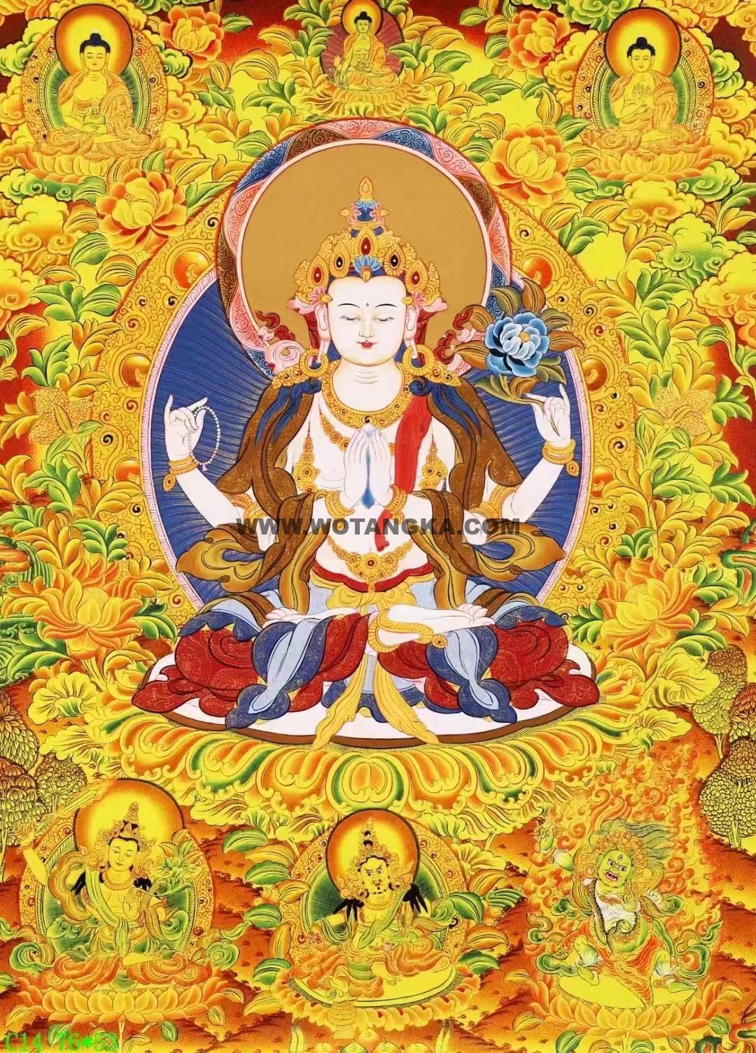尼泊尔知名唐卡画师纯手绘布本唐卡【四臂观音·三怙主】,作品采用24K真金金粉混合天然颜料纯手绘而成。作品主尊宝相传神。布图干净精美、画工非常的细腻,严格的遵照佛经的度量仪轨如法绘制,期待有缘人。