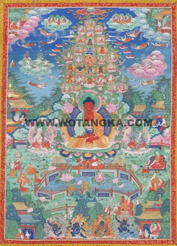 此幅表现的是阿弥陀佛的西方极乐净土世界。阿弥陀佛红色身,双手托钵,现禅定相,佛顶上绘黄教所奉祖师、本尊及诸神祇,自上而下列宗喀巴师徒三尊、五方佛、本初佛、密集金刚、胜乐金刚、大威德金刚并观音、文殊等大菩萨以及佛母、乐天、空行、护法等众神,构成了佛法传承关系。