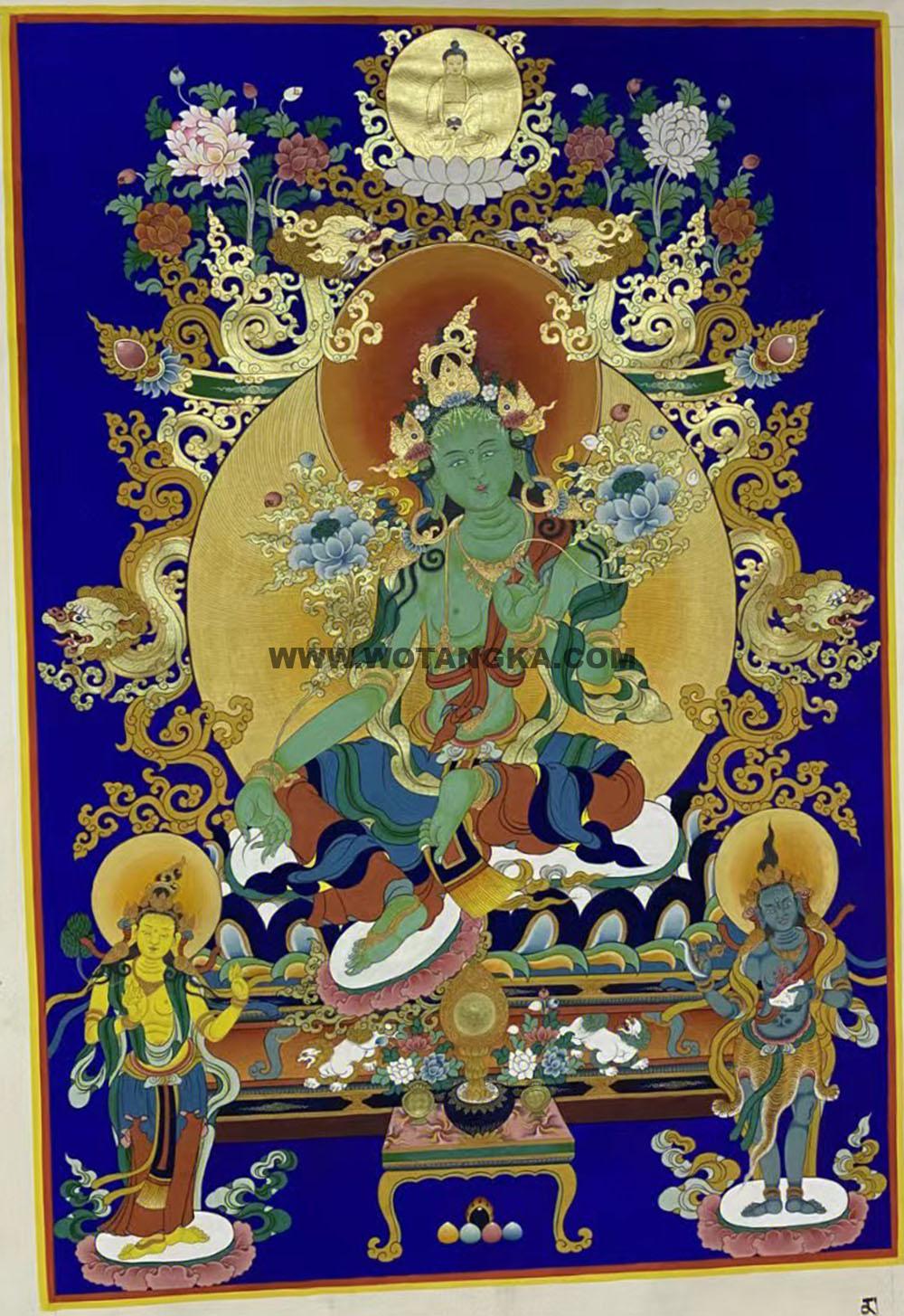 中国唐卡艺术作品中的【绿度母】唐卡手绘布本,热贡知名画师格桑多吉·画院出品,收藏供奉不要错过。作品主尊宝相传神, 采用天然矿石晕染,纯金描线,画工细腻,殊胜,精美、风格富丽,采用24K真金描绘,画工细腻,开脸殊胜,是一副难得一见的好唐卡作品。