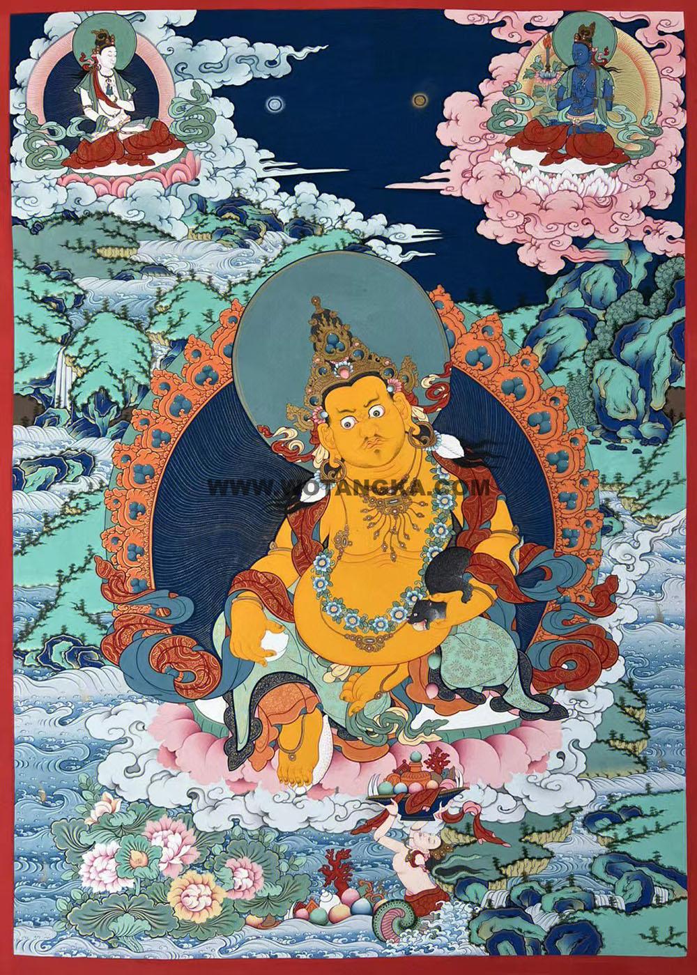 黄财神是藏传佛教各大教派普遍供养的五姓财神之一,因其身相黄色,故称黄财神。修持黄财神法、持诵其密咒,可获得黄财神庇佑,能增长福德、寿命、智能、物质及精上之受用,不被生活所逼,以及一切经济压迫,可安心向道。但修法者需发无上菩提心,广结善缘,勤行布施。万勿悭贪成性,护法降罪也. 黄财神面慈目善,头戴宝冠,坦胸露腹,戴着珍宝璎珞、珍宝耳环、珍宝手镯和珍宝足钏,上身穿丝制天衣,下身着丝制裙子,右手于右膝上捧喷焰末尼,左手握着吐宝鼬,以威镇坐姿坐在莲花宝座中央。身后有光环、祥云、远山。能增长福德、寿命、智慧、物质及精神上之受用。主司财富,能使一切众生脱于贫困,财源广进。