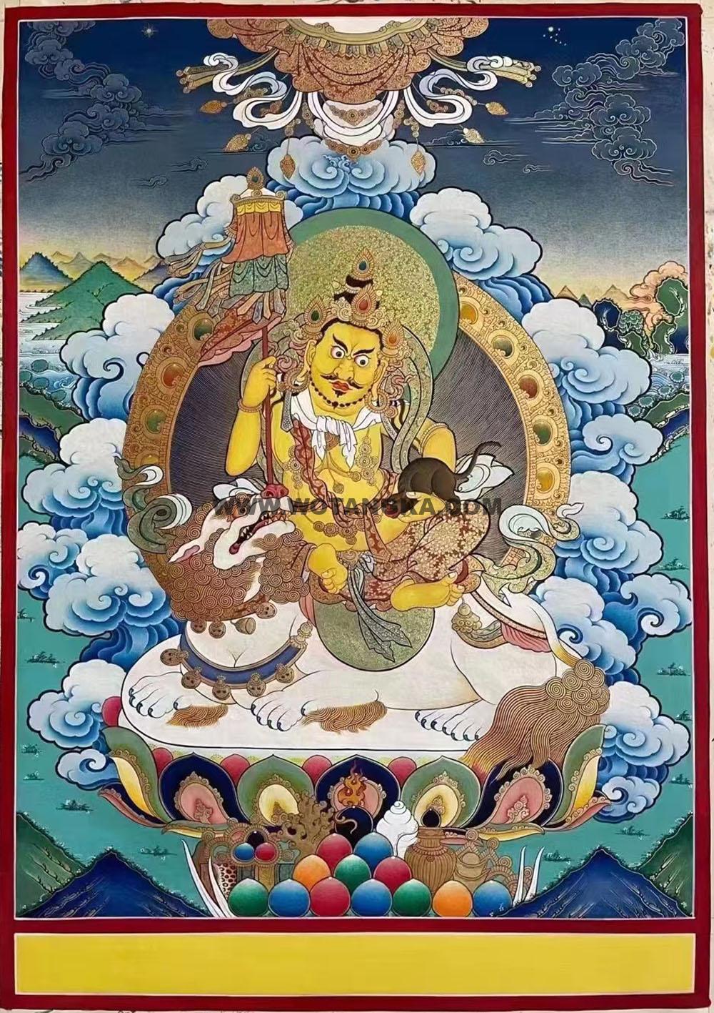 中国唐卡艺术作品中的【财宝天王】唐卡手绘布本,热贡知名画师拉藏·画院出品,收藏供奉不要错过。作品主尊宝相传神, 采用天然矿石晕染,纯金描线,画工细腻,殊胜,精美、风格富丽,采用24K真金描绘,画工细腻,开脸殊胜,是一副难得一见的好唐卡作品。