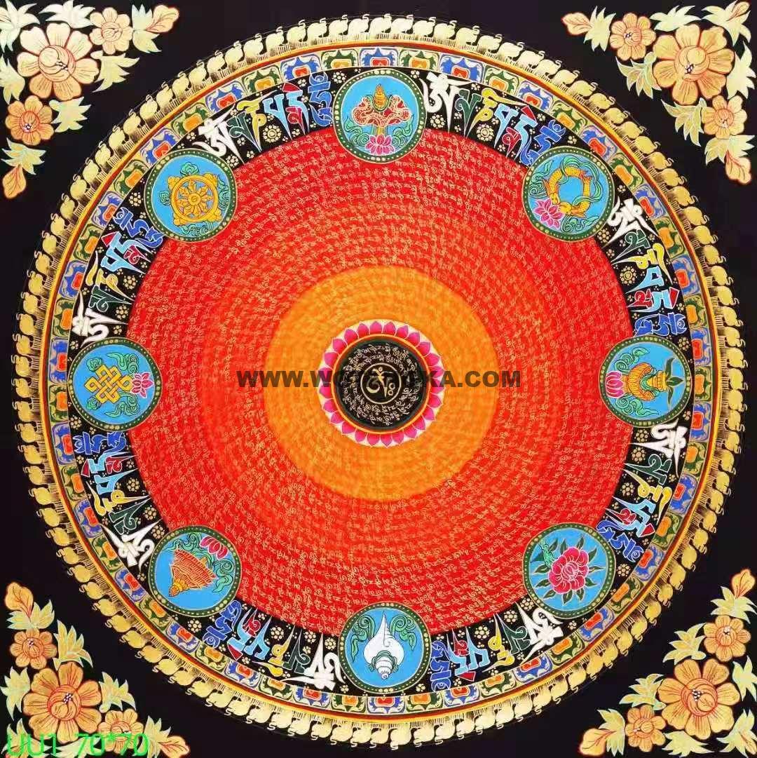吉祥八宝六字真言经文坛城唐卡 【吉祥八宝坛城】曼陀罗,唐卡手绘布本。作品采用金粉混合天然颜料纯手绘而成,画工细腻,精致,精品不要错过。