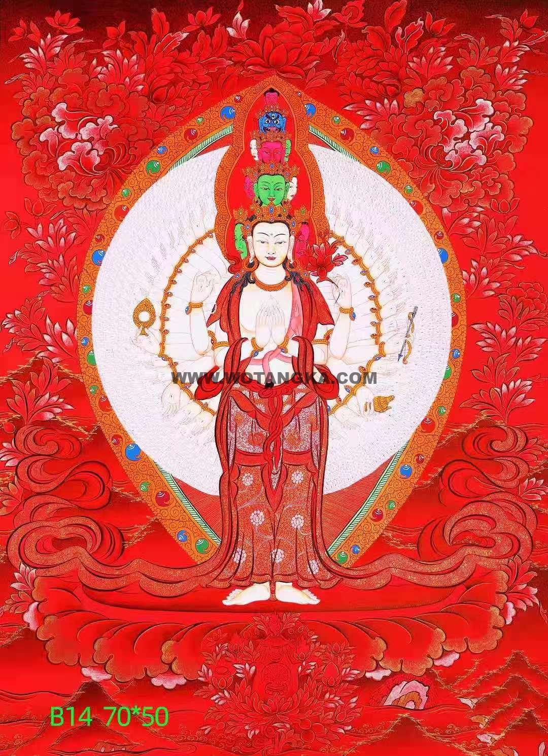 尼泊尔画师力作纯手绘布本唐卡【千手观音】。作品采用金粉混合天然颜料纯手绘而成。作品主尊宝相传神。布图干净精美、画工非常的细腻,严格的遵照佛经的度量仪轨如法绘制,期待有缘人。