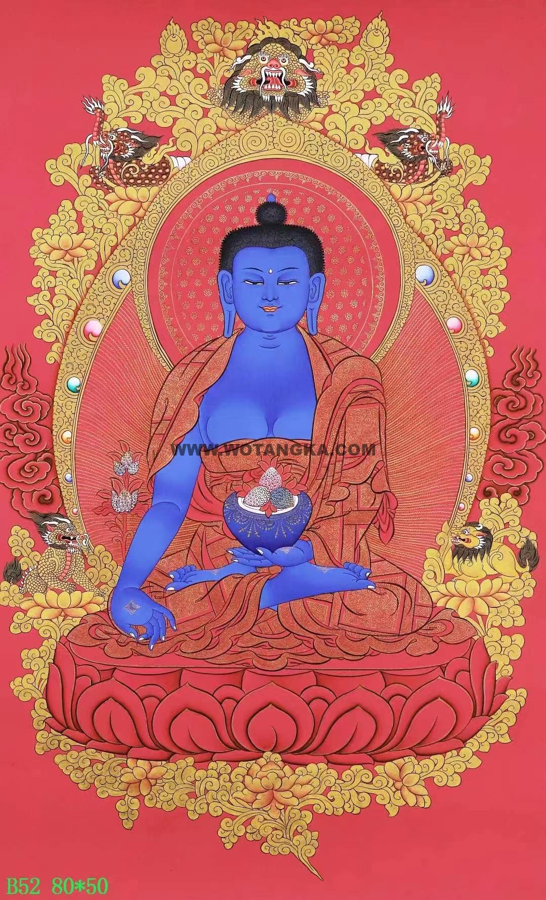 尼泊尔知名唐卡画师作品《药师佛》,作品采用24K真金描线,混合天然颜料纯手绘而成。作品主尊宝相传神,布图干净精美、画工非常的细腻,严格的遵照佛经的度量仪轨如法绘制,期待有缘人。